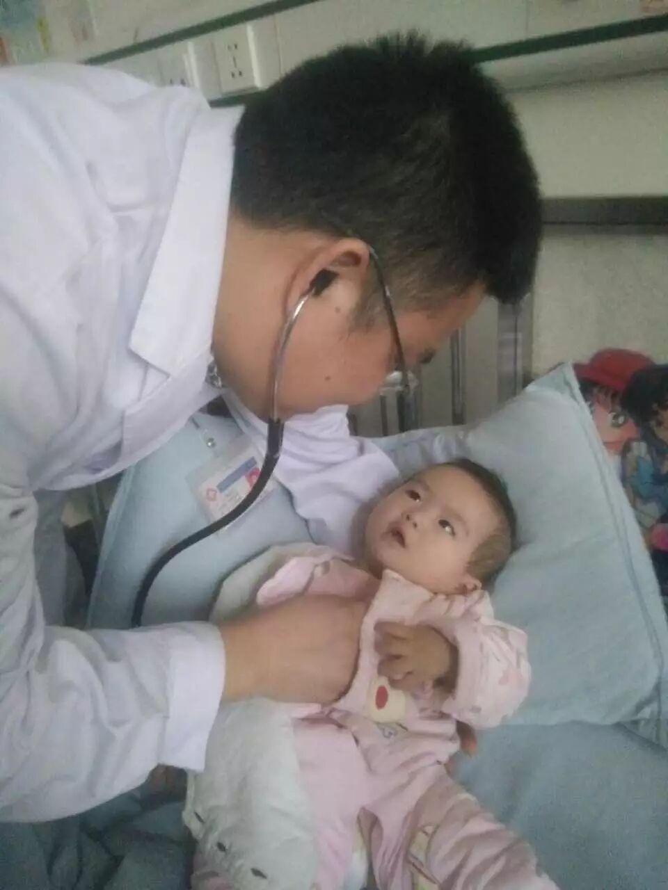 市人民医院儿科医生陈龙宋查房过程中,为一名1岁多的患儿听诊,小家伙用好奇的眼神看着这位和蔼可亲的叔叔。 这一幕被旁边的家属用手机记录下来,发到微信群中。