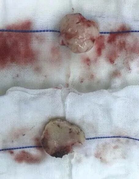 ▲患者左侧桥小脑角肿瘤 ▼手术中取出的脑肿瘤