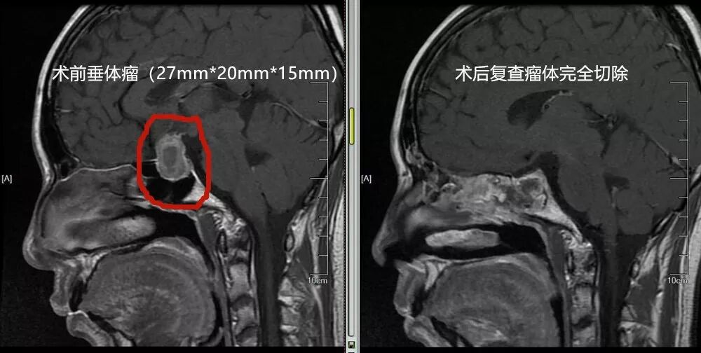 32岁的刘女士,2年前无明显诱因出现闭经、泌乳,想着自己又不是哺乳期,突然出现这种情况,刘女士决定来浏阳市人民医院看看。经我院多学科诊治,考虑垂体瘤,当时瘤体较小,刘女士在接受药物治疗后,月经正常,泌乳症状消失。今年7月份,刘女士发现自己视力明显下降,想起我院神经外科医师的叮嘱,垂体瘤进一步增大将鞍膈顶起或穿破鞍膈向鞍上生长,可压迫视交叉神经,而引起视力下降及视野改变。于是,赶紧来我院复查,发现垂体瘤已有鹌鹑蛋大小,并有神经压迫表现。我院神经外科易征主任医师看过片子,仔细询问了病史及详细查体后,告诉刘女士:泌乳、视力下降的“元凶”就是颅内这颗肿瘤,学名“垂体瘤”,也是引起刘女士泌乳素分泌增高,导致泌乳,压迫视神经,导致视力下降的“元凶”。